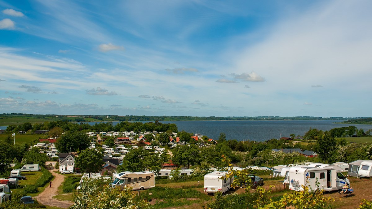 Vi har mange og skønne terrassepladser med panoramaudsigt over Hjarbæk Fjord. Jo højere pladsnummer, des bedre udsigt!